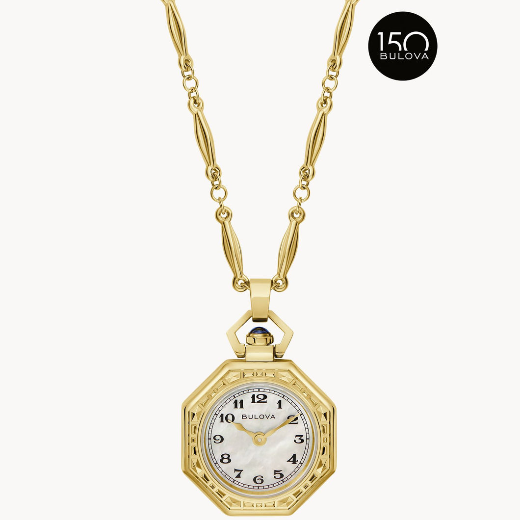 Tracing its roots to Bulova’s Rubaiyat pendant watches from the early 20th Century, the new limited-edition Art Deco Rubaiyat pendant watch captures Bulova’s rich history in a versatile design to celebrate our 150th Anniversary. Inspired by a 1919 Rubaiyat design, this elegant pendant watch has a polished octagonal gold-tone stainless steel case appointed with a raised border motif and a blue synthetic spinel cabochon on the 12 o’clock crown. Lustrous and sophisticated, the mother-of-pearl dial has vintage-inspired hands and printed Arabic numerals, while the individually numbered case back showcases an embossed image of the Goddess of Time. Evoking its predecessor, a matching 30-inch chain with a lobster claw closure carries the pendant case, affording stylish versatility as a necklace, wristlet, or belt accessory. At once contemporary and vintage, this new Bulova Rubaiyat pendant watch is delivered in a custom luxury case with a storybook and is a must-have accessory for the modern wardrobe. Limited to 5,000 pieces worldwide.