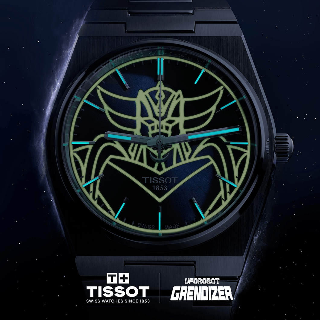 The Tissot PRX Ufo Robot Grendizer merges 70s design with manga anime elements. It features a 40mm case, made of 316L stainless steel and an interchangeable quick-release bracelet. The dial glows with a Super-LumiNova® bust of Grendizer, complemented by a Harken-style second hand and engraved rotor, evoking nostalgia for fans of the series. Powered by the Powermatic 80 Swiss automatic movement, it offers an 80-hour power reserve. With a see-through case back and scratch-resistant sapphire crystal with antireflective coating, this watch is an all-in-one that blends modern watchmaking with 70s designs and iconic manga culture.